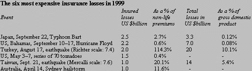 Almost half of the insurance industry's claims originated from six billion-dollar loss events. Typhoon Bart caused insured losses in Japan of approximately $2.5 billion, and, in the Bahamas and on the southeast coast of the US, Hurricane Floyd was responsible for around $2.2 billion in damage.
