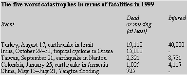 According to Swiss Re's sigma study, 52,000 people were killed by catastrophes in 1999, with natural catastrophes being responsible for more than 80 percent of all victims. Nearly 25,000 victims lost their lives as a result of earthquake, and more than 16,000 as a result of storms.